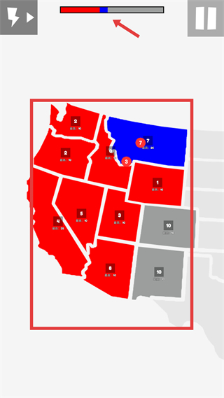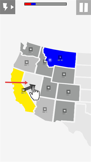 2、關卡界面顯示分區地圖,不同區域有對應的數字標識,通過點擊己方區域并拖動至目標區域,以此擴張己方的地圖控制范圍。