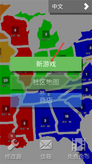 1、進入游戲主界面后,能看到社區地圖與各類功能按鈕,點擊新游戲按鈕即可進入游戲關卡,開始地圖戰爭的挑戰進程。