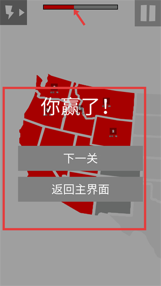 4、當成功占領全部可爭奪區域后,界面會顯示你贏了的提示,同時出現下一關與返回主界面按鈕,點擊對應按鈕可選擇繼續挑戰或回到主界面準備。