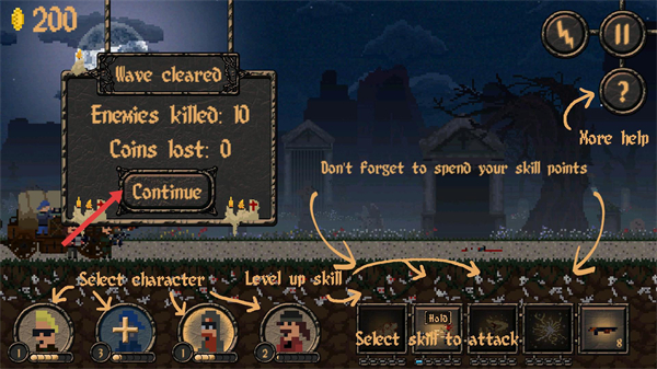 4、通關后會顯示結算界面,可查看消滅敵人數量、損失金幣等信息,點擊【Continue】繼續游戲。