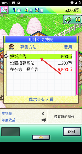 3、進入人員募集方法的選擇界面后,挑選報紙廣告這一選項,該選項會消耗一定的游戲貨幣,是游戲初期適用的人員募集方式。