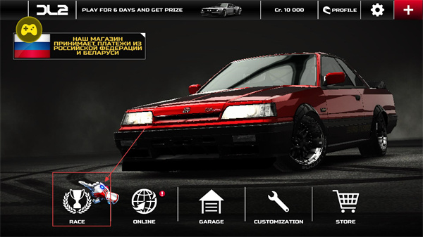 1、主界面的RACE按鈕是賽事入口,點擊可進入賽事選擇界面,可先從基礎賽事入手,積累經驗與獎勵以解鎖更多內容。