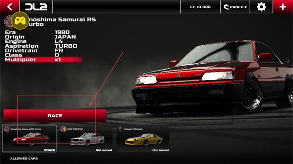 1、選擇參賽賽車時,需確認其適配當前賽事規則,屬性適配多彎道賽道,點擊RACE按鈕即可進入賽事,優先用適配車型能提升比賽表現。