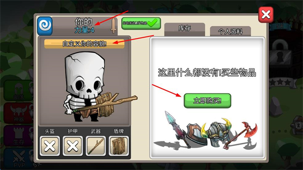 2、角色界面可自定義容貌,庫存無裝備時,點擊立即購買去商店選購武器提升力量。