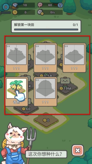 1、先解鎖第一塊田,選擇要種植的作物比如香蕉,點擊對應作物卡片就能把它種到田地里,完成種植后等待作物生長,后續可收獲對應資源。