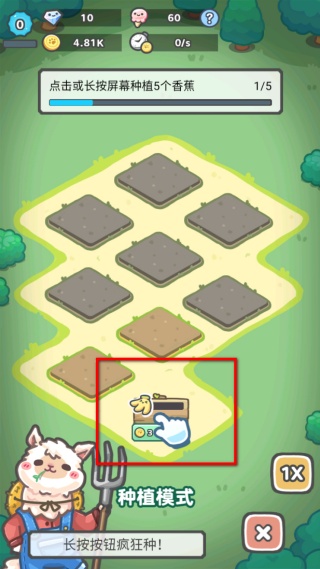 2、進入種植模式后,點擊或長按屏幕來種植作物,按要求種植指定數量的作物,比如種植5個香蕉,完成后可推進種植進度獲取更多資源。