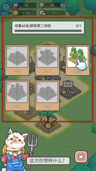 3、收獲作物獲取金幣,當收集到足夠金幣后解鎖第二塊田,解鎖后可以選擇新的作物比如黃瓜進行種植,持續拓展種植區域增加資源產出。