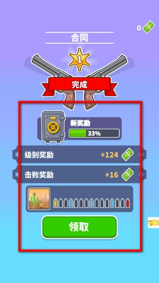 4、完成任務后進入獎勵界面,點擊領取按鈕獲取對應的級別獎勵和擊敗獎勵,積累游戲內的資源和道具。