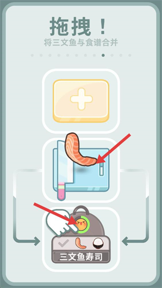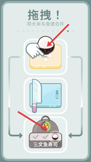 4、將大米拖拽到食譜區域,與已有的材料合并,完成三文魚壽司的全部材料組合,最終可生成對應的成品料理,完成烹飪任務。