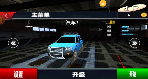 2、進入車輛選擇頁面,看到藍色汽車及升級等功能選項,點擊右下角開始按鈕進入關卡目標提示界面。