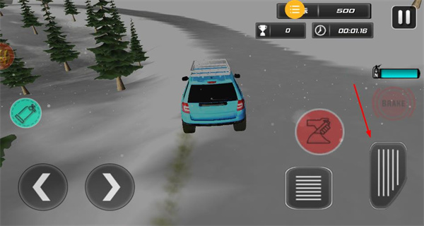 4、進入雪地賽道的駕駛場景,操控藍色汽車行駛,借助右側操作按鍵進行漂移操作,積累分數以達成關卡目標。