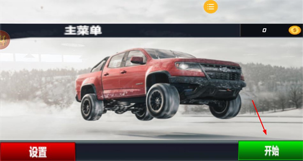 1、打開游戲后,進入主菜單頁面,看到紅色越野汽車的展示界面,點擊右下角開始按鈕進入車輛選擇頁面。