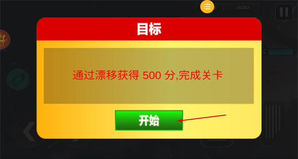 3、在關卡目標界面,看到需通過漂移獲得500分來完成關卡的任務提示,點擊開始按鈕進入游戲駕駛場景。