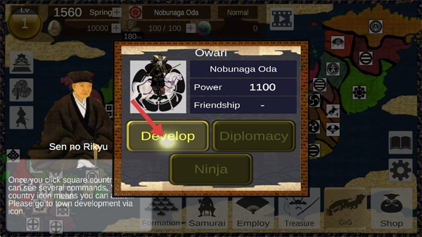 3、在領地菜單中選擇Develop選項,可進入城鎮發展界面,該功能用于提升領地的資源產出或基礎屬性,是增強勢力的核心操作之一。