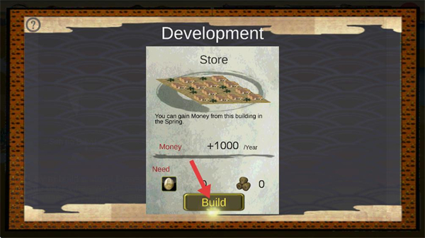 4、在發展界面選擇建筑,點擊Build完成建造,該建筑可在春季產出金幣,不同建筑對應不同資源或功能,助力勢力擴張。