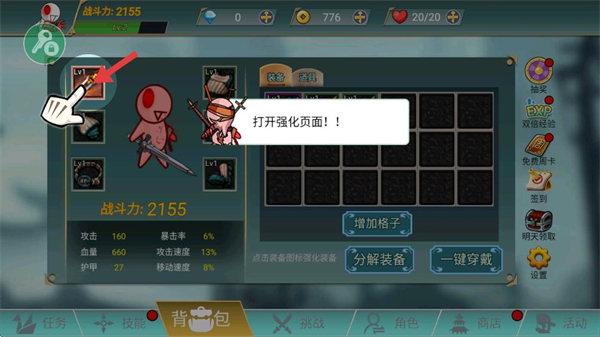 1、在挑戰界面點擊背包圖案,進入背包界面強化、穿戴裝備,升角色戰斗力。