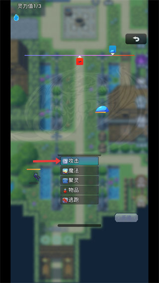 3、進入戰斗頁面,下方有攻擊、魔法等操作選項,需結合當前靈力狀態挑選合適指令,比如用攻擊技能應對當前敵方目標,推進戰斗,將怪物擊敗。