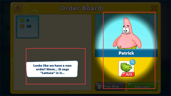 1、查看訂單板里的內容,了解派大星的訂單需求是收集生菜,明確任務目標,為后續操作做準備。