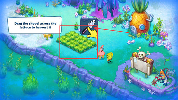 3、拖動鏟子工具到生菜區域,完成生菜的收割操作,獲取任務所需的生菜資源。