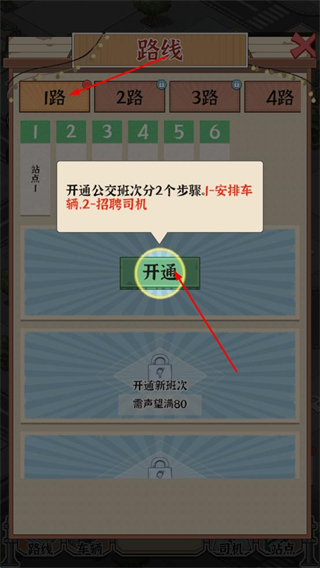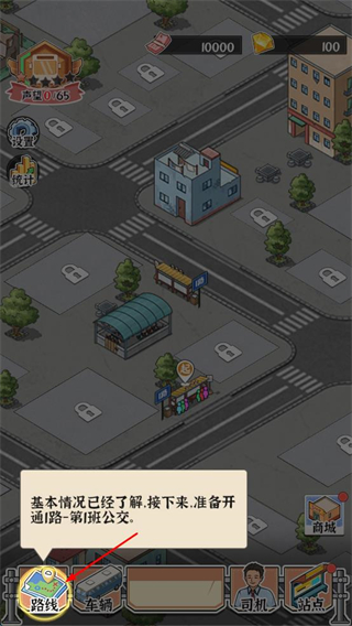 1、主界面點擊路線按鈕,進入路線規劃頁面,按提示準備開通1路第1班公交,推進游戲流程。