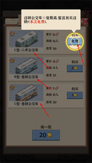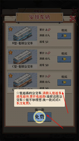 3、安排車輛時,可查看不同公交車屬性,星級越高滿載、速度、票價越好,本次點免費選當前最優公交。