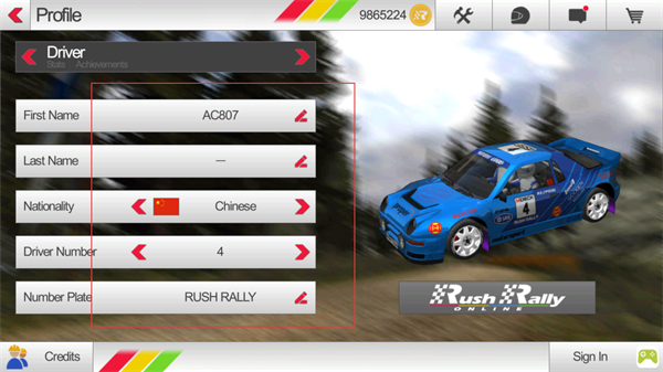 2、在個人資料界面設置車手信息,調整姓名、國籍等內容,完成后進入游戲的競速流程。