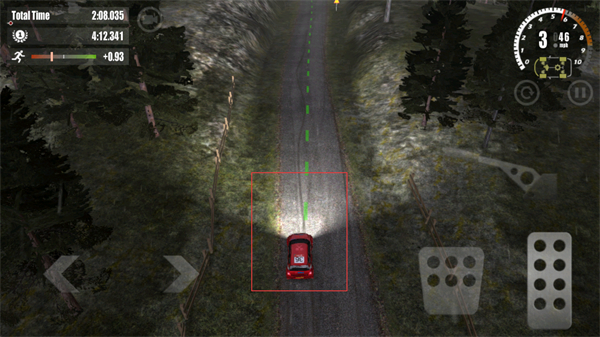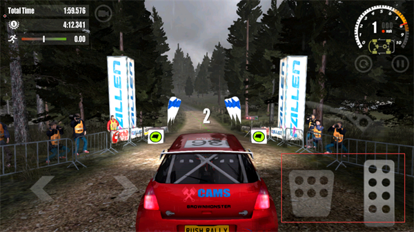 3、操控右側的控制按鍵,駕駛紅色賽車通過起點拱門,開始拉力賽道的競速比賽。