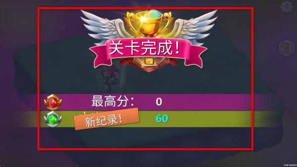 4、當達成關卡目標后會顯示關卡完成,同時會展示最高分和本次得分,若本次得分更高還會出現新紀錄提示。