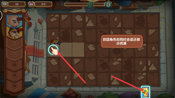 4、點擊戰場中的角色可將其召回召回時會返還部分資源,可利用此功能調整戰場部署,同時合理回收資源用于后續的角色配置。
