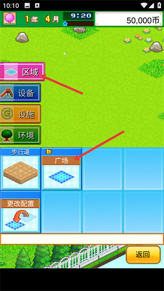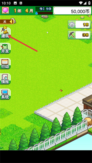 1、進入游戲界面后,點擊開始按鈕,進入公園的建設場景,此時可以看到場景內的初始區域和功能選項。