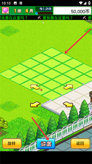 4、選擇合適的場地位置,調整設施的擺放區域,點擊設置按鈕,完成設施的布置操作,推進公園的建設進度。