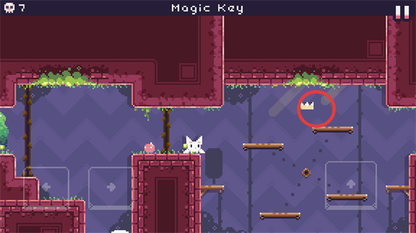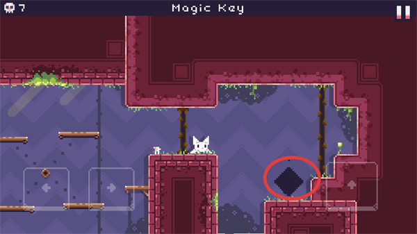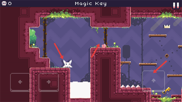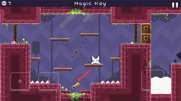 3、場景下方出現鑰匙,操控貓咪向下跳躍到對應平臺,靠近該鑰匙觸發收集。