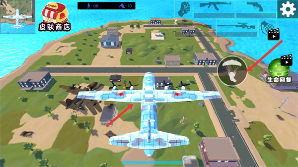 2、處于飛機空投場景,可通過右側的降落傘標識選擇降落區域,優先挑選建筑密集的區域,以便落地后快速獲取武器裝備,提升前期的作戰能力。