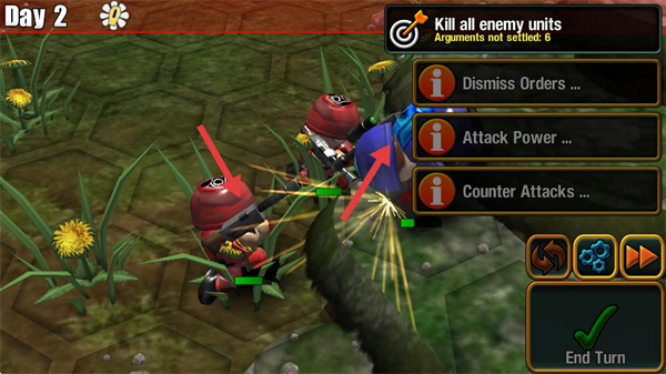 2、戰斗界面為六邊形網格地圖,玩家需操控己方單位執行移動、攻擊等操作,回合結束后點擊EndTurn切換至敵方回合。