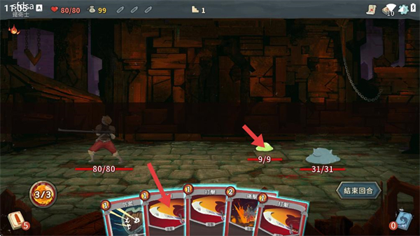 3、戰斗界面采用回合制卡牌對戰,玩家需使用手牌消耗能量擊敗敵人,同時需關注自身生命值與敵人狀態。