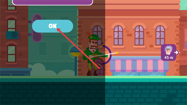 1、界面顯示角色與目標距離提示,點擊上方的【OK】按鈕可確認當前狀態,開啟后續的射擊操作流程,這是進入關卡核心玩法的前置步驟。