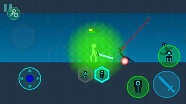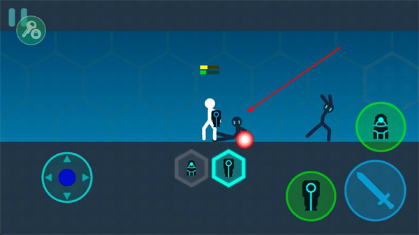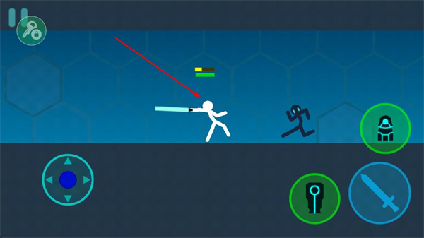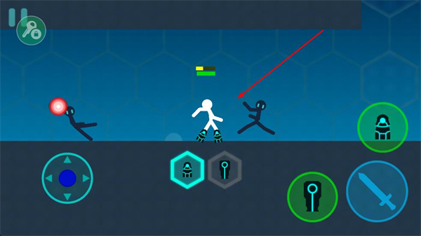1、打開游戲進入對戰場景,操控左側方向鍵移動火柴人角色,靠近敵方火柴人,準備發起攻擊。
