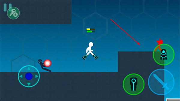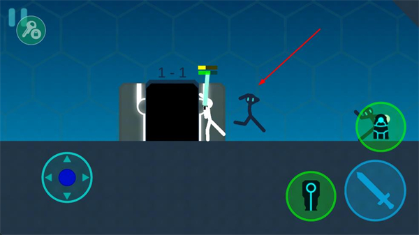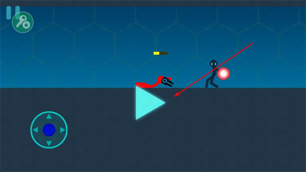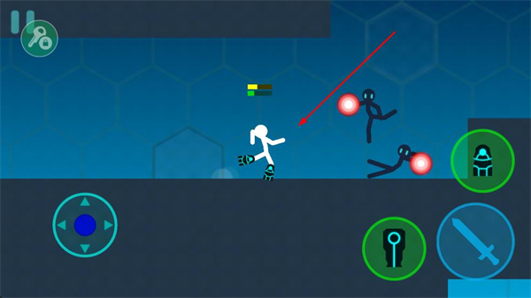 1、打開游戲進入第一個關卡場景,操控左側方向鍵移動火柴人角色,避開敵方火柴人的初始攻擊。