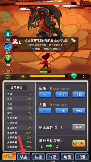 1、界面顯示主角屬性界面,可分配剩余屬性點提升體質、力量等,還能點擊下方【裝備】切換界面,同時注意攻擊時的屬性克制規則,水克火、火克木、木克水。