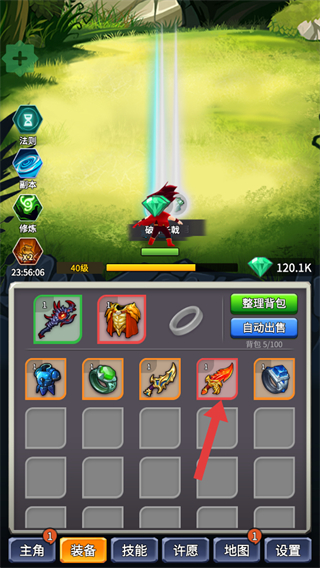 2、切換到【裝備】界面后,可見背包內的裝備道具,點擊對應裝備可查看其屬性,后續可選擇合適的裝備進行穿戴,提升主角的戰斗能力。