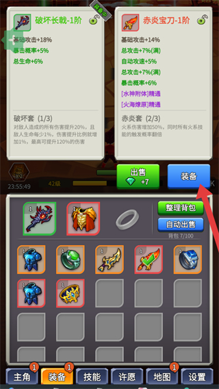 3、選中裝備后會顯示其詳細屬性加成,確認裝備適配當前角色后,點擊【裝備】按鈕即可穿戴該裝備,同時可出售不需要的裝備獲取鉆石。