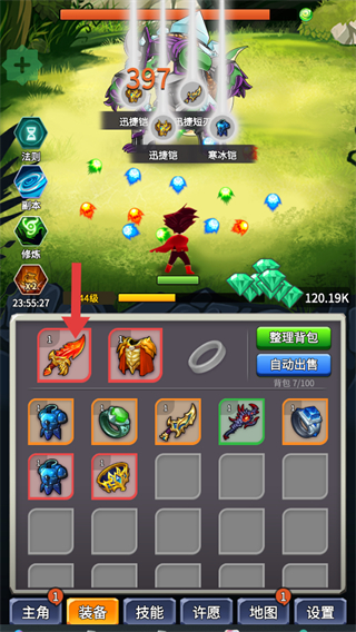 4、成功裝備道具后,返回戰斗場景,主角會自動攻擊敵人,戰斗中會掉落鉆石等資源,這些資源可用于后續的屬性提升、裝備強化等操作。