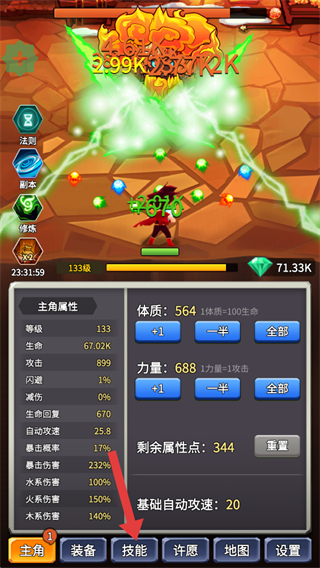 1、界面顯示主角屬性面板,可分配剩余屬性點提升體質、力量等,點擊下方【技能】按鈕可切換到技能界面,同時戰斗中會自動獲取資源,助力角色養成。