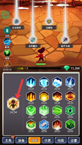 2、切換到【技能】界面后,可見各類技能圖標,左側顯示當前技能等級進度,點擊對應技能可查看其詳情,后續可對技能進行升級操作來增強效果。