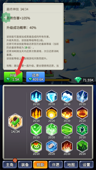 3、選中技能后會顯示其升級詳情,升級成功概率偏低,消耗鉆石可嘗試升級,升級失敗會降級,還能使用還原功能恢復至歷史最高等級,需合理規劃升級。