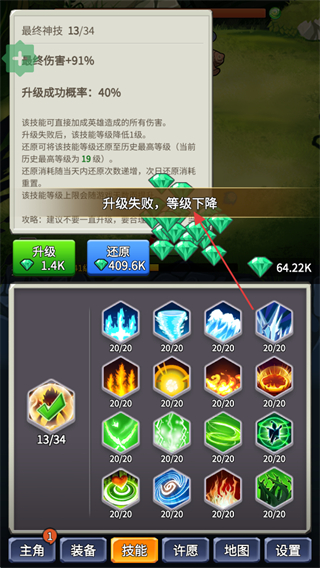 4、技能升級失敗后等級會下降,此時可選擇再次嘗試升級,或使用還原功能,同時注意鉆石消耗,后續可根據資源情況調整技能升級的策略。