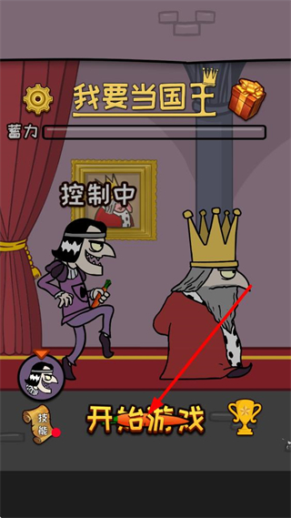 1、進入游戲界面可見我要當國王標題,搭配蓄力條及功能按鈕,點擊開始游戲按鈕,即可進入游戲的游玩環節。