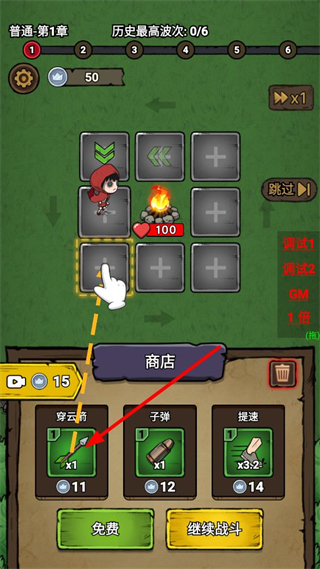 1、進入游戲普通第1章界面,可見商店入口,消耗界面內的貨幣可商店中購買穿云箭等道具,為后續的戰斗儲備物資。