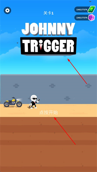 1、進入游戲關卡,點擊按鈕點按開始,操控角色騎摩托出發,準備射擊敵人,開啟冒險挑戰。