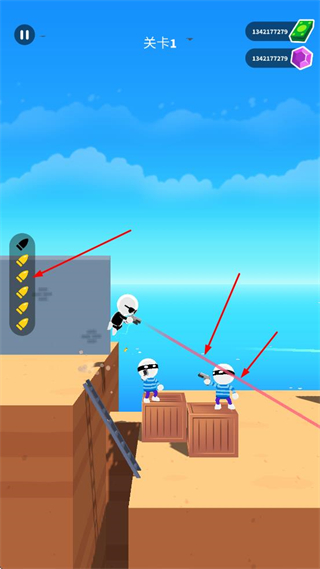 2、關卡過程觀察敵人位置,控制射擊角度與彈道,利用地形如箱子掩護,精準射擊敵人,注意關卡有6發子彈。